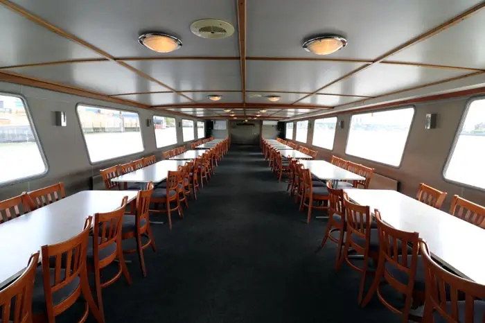 Il salone principale è arredato con eleganti tavoli e sedie, il che la rende una scelta popolare per crociere con cena estive e natalizie (fino a 128 ospiti) o buffet con posti a sedere (fino a 112 ospiti). Il salone è inoltre sufficientemente ampio per ospitare ricevimenti e feste in piedi (fino a 180 ospiti). Il salone è dotato di ampie finestre che offrono una vista eccellente e ospita un bar con licenza completa e i servizi igienici.
